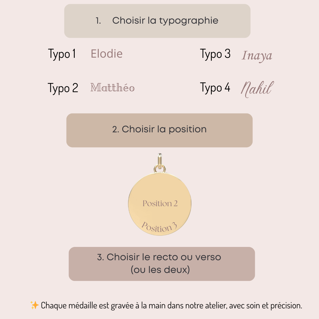 Toutes nos pièces peuvent être gravées, pour en faire un bijou vraiment unique. Selon le modèle, l’emplacement de la gravure peut varier, mais notre équipe veille toujours à garantir un rendu harmonieux et élégant.